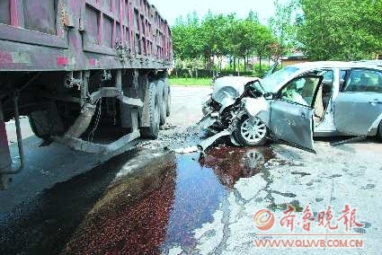 记者在现场看到,银色尼桑轿车在剧烈的撞击下,整个车体已经完全变形,事故现场到处都是尼桑轿车散落的零件,尼桑轿车的整个车盖被挤压成一团,车盖内部的零部件全部露在外面,部分已经被挤得粉碎,前挡风玻璃也在冲击力的作用下凹了下去,由于剧烈撞击,尼桑轿车的保险杠、车灯、车盖以及左前侧车门毁坏严重,粉碎的车灯碎片洒落一地,尼桑轿车水箱内的防冻液、水以及变速箱里的齿轮油也在剧烈的撞击下漏了出来,油水混在一起流淌到货车的前轮处。