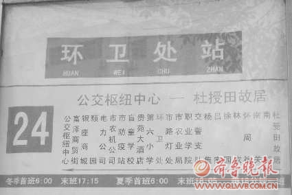 记者就此事咨询了市公交公司韩主任。韩主任说:“六小的站牌坏了,正准备前去更换新的站牌。而由于有些站牌面积有限,上面只能标注一些大站。”对于24路由环卫处至杜受田故居没有站牌一事,韩主任解释,一个原因是很多站牌被偷了,目前正在检修过程中,另一个原因就是24路公交车路线调整,站牌未能及时设立。