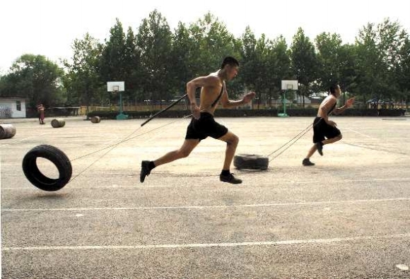 27日,在高温下,一批“80后”、“90后”武警聊城支队反恐特战队员进行“拉车胎”体能训练,提高队员反恐及处置突发事件的适应能力。