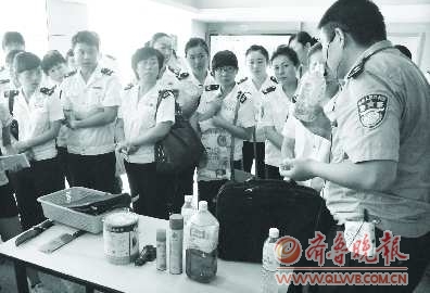 28日,防爆、防恐专家演示如何辨别汽油、仿真手枪等违禁品。当日,青岛市公安局四方分局阜新路派出所和青岛交运集团汽车总站共同邀请了防爆、防恐专家,为青岛全市各个长途汽车站的120名安检员讲解安全知识,并强化了安检培训。