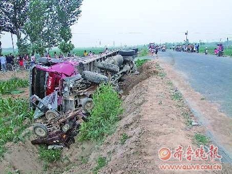 7月21日17时12分,在商河境内某路段,一辆拉沙子的大货车与前方行驶的一辆大货车追尾相撞,拉沙子的货车侧翻入路边沟中。