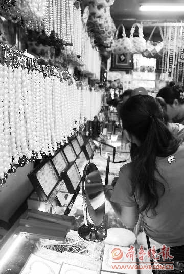 记者于28日来到万平口精品、饰品市场,尽管天气较热,但市场里依然十分热闹,四处可闻叫卖声、讨价还价声。记者发现,同样规格的圆型珍珠贝手链,在批发市场的售价仅为3元,而在万平口精品、饰品市场“散户区”售价为8-35元,店里的标价为40元,并且不议价。