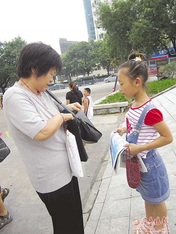 7月29日,记者在大润发超市附近看到,一名身穿背带裙的小女孩,手里拿着几份报纸穿梭在人群中,逢人就小声地问买不买报纸。“阿姨,买份报纸吧?”女孩小心翼翼地向一位女士询问。“这么小就上街卖报了?好,拿一份吧。”这位女士鼓励道,“孩子,你要勇敢点,说话大声点才好。”女孩听了,微笑着点点头。