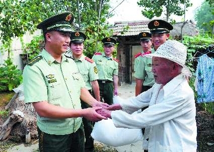 “八一”建军节前夕,武警临沂支队直属大队三中队官兵,来到了临沂市经济开发区重沟街道办事处三官庙社区,亲切看望中队多年来一直帮扶的五保户,为他们送去了生活必需品。