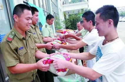 7月30日,兰山区南坊街道西南坊村群众自发到区消防大队看望消防官兵,为他们送上米、面、油、肉和部分消暑物品,畅叙鱼水深情。