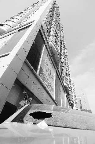7月31日下午3时许,记者赶到市区金坛路与八一路交会处的阳光高第,在该小区B楼西单元楼前,记者发现楼下有不少玻璃碎渣以及墙皮等建筑碎渣,一辆自行车倒在地上,附近一辆银色轿车的后玻璃被砸出一个窟窿。