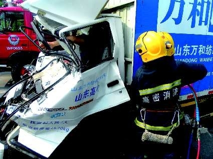 7月31日上午,在坊子区潍胶路路段,一辆小货车与一辆油罐车发生追尾,变形的货车将驾驶员困住,坊子消防第六中队消防人员赶到后,经过十分钟的紧张救援,将驾驶员救出。