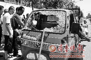 7月30日10时30分,一市民拨打本报热线称,在新建路西侧靠近新湖南大街的位置,一辆装有西瓜的农用三轮车被一辆城管执法车截住,数名城管队员使用铁锹等将三轮车的前挡风玻璃砸碎。记者随后赶到事发现场,现场围满了群众,三轮车停在路边,前挡风玻璃已粉碎,驾驶室里有不少碎片。三轮车司机王文全的脸上有伤痕,衣服上也有不少泥土。