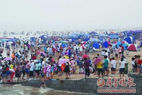 7月31日,在石老人海水浴场,前来纳凉游玩的市民、游客挤满了沙滩。当日,青岛市区最高气温达到31.9℃,是近一个月来的最热天。