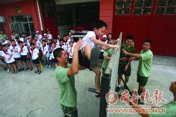 7月31日,在杭州路消防站,青岛杭州路小学少年消防团的队员在消防官兵的帮助下勇敢翻越两米高的板障。“八一”建军节来临,杭州路小学少年消防团给消防队员送去西瓜和矿泉水,表达了他们的崇敬之情。小队员们还参加了消防站的日常训练项目。