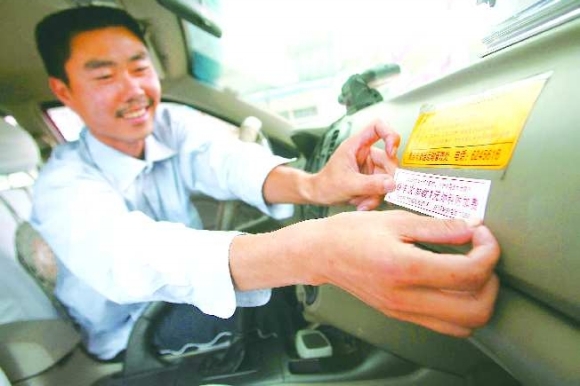 31日,在烟台公交集团出租车公司,一名出租车司机将“每车次加收1元燃料附加费”的标签贴到显眼位置。自8月1日起,烟台六区范围内营运的客运出租汽车,在计价器显示金额之外,由驾驶员向乘客收取燃料附加费,每车次1元。 本报记者 赵金阳 摄