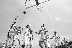 31日,在烟台市牟平一中新校区体育场,2011年烟台市中学生体育联赛男子组篮球决赛在烈日下激情开打,最终烟台华侨学校篮球队技高一筹,获得篮球比赛男子组第一名。本报记者 赵金阳 见习记者 李泊静 摄