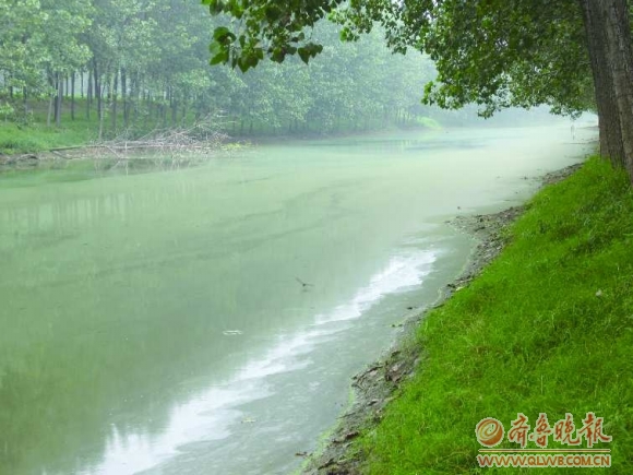 记者来到向阳河边看到,这条河河面约有十米宽,河上漂浮着像油一样的绿色东西。宋兆海告诉记者,他们浇地的时候水发绿,抽出来的水看上去像加了洗衣粉一样,泡沫很多。
