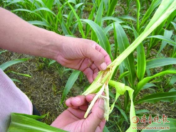 本报6330000热线消息(记者 李贺) 郓城县武安镇宋花园村村民李淑兰最近一直心急如焚,她家种植的8亩玉米都出现了死苗的现象,甚至面临绝产。7月30日,记者来到郓城调查发现,宋花园村400亩玉米都出现了这种情况,附近的海王庄、张英庄等好几个村子上千亩地也出现了这种情况。村民怀疑是用向阳河里的水浇地导致的,据村民反映,用河水浇地的庄稼都发病了。