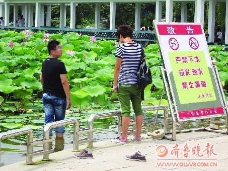 7月30日上午,记者在龙泉广场的荷花池边发现,一块写有“严禁下水、玩水、趟水、禁止捕鱼,违者罚款”的警告牌。但就在警告牌旁,有两个年轻人脱掉鞋子,卷起裤管,站在池中想去摘荷叶。由于池中很滑,让人不禁为他们的行为捏一把汗(如右图)。