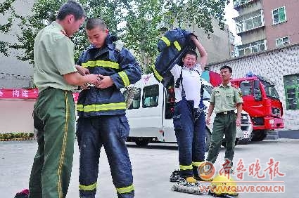 “八一”期间,济南市实验初中和山师附小的20余名同学来到市公安消防支队市中区大队第22消防中队,观摩消防战士的精湛表演并实地体验消防着装。