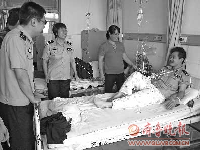 2日,在医院的岳某(右一)说,“当时一心就想着抓嫌疑人,把嫌疑人控制住后,才感觉钻心疼。”