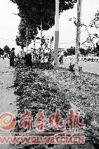 8月2日下午,在德州市大学路,园林工作人员正在路边补植植被。园林工人说,近期雨水充足,苗木成活率较高,是恢复植被的好时机。