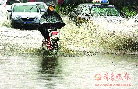 2日,济宁普降中到大雨,局部暴雨,城区降水量为41.8毫米。在济宁市火炬路上,由于地面积水,市民骑行电动车如同“冲浪”。