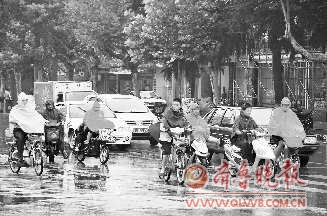 8月2日的降雨,给持续高温的枣庄带来了一丝凉意。图为市民穿着雨衣穿行在市区。