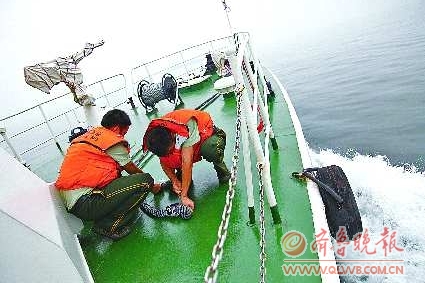 月1日上午,在海警37043艇前甲板上,两名海警战士在闷热的天气中作业。