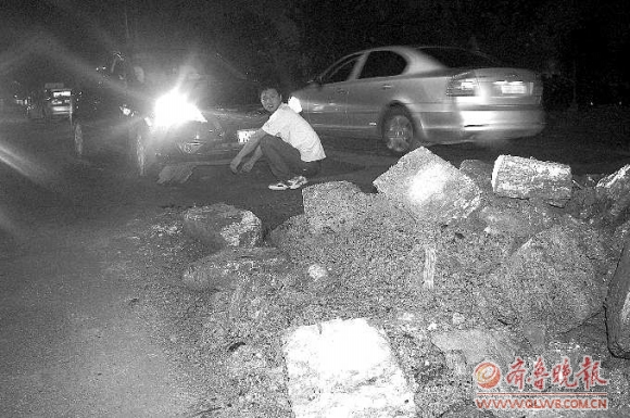 8月2日晚22时许,菏泽仓房路口北100米太原路中央,一堆近半米高的施工碎石未得到及时清理。由于现场没有任何提醒标识,一辆自北向南行驶的黑色轿车撞了上去。车身前方的保险杠被撞坏。附近居民表示,这堆碎石在这好几天了也没人清理,已伤了多辆车。 本报记者 邓兴宇 摄影报道