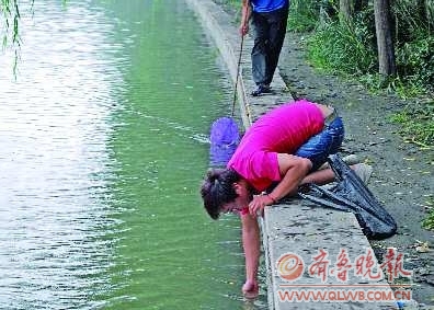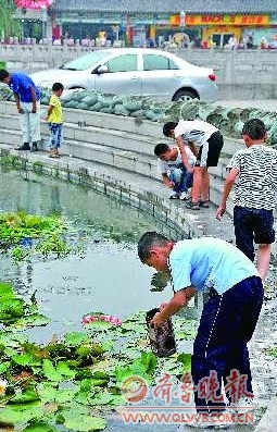 在荷花仙子广场周围,也聚集了不少捕鱼的人,除了渔网,一些人“别出心裁”,拿着纸篓、小滤网来捞鱼,虽然“战果不佳”,但依然无法阻止他们捕鱼的乐趣。“这里的水面比河道中稍微浅一些,但因为小孩子较多,安全隐患依然很大。”河道管理员告诉记者,1米多深的水,对于不会游泳的小孩子来说很危险。