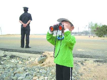 作品描述:小宝贝手持望远镜,在海阳市亚沙会场地“视察”工地的进程。
