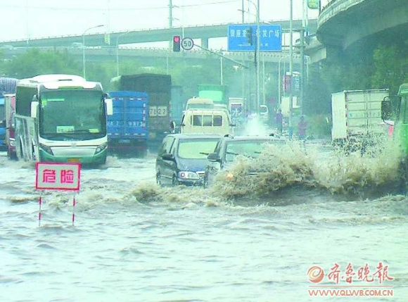 连续两天省城迎来降雨,5日18时至6日18时,济南平均降雨量19.5毫米,其中市区雨量达31.3毫米。图为8月6日,一场大雨让济南市二环北路盖家沟段变成一片汪洋。由于道路积水严重,该路段出现严重堵车,车辆绵延近50米,部分骑自行车或者电动车的市民干脆绕道而行。 通讯员 袁庆生 摄影报道