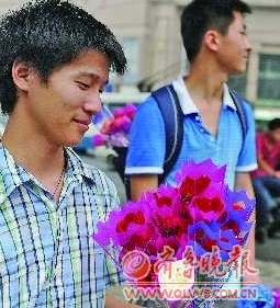 6日下午,省城街头卖玫瑰的学生正在发愁。由于下雨,行人较少,玫瑰价格从上午的每枝10元,迅速下滑到下午的每枝3元,一些玫瑰没准就砸在自己手里了。