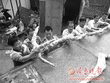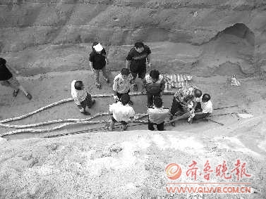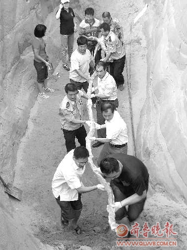 据了解,为了尽快完成田野发掘工作,让船锚、锚链早日回到古沉船身边,8月6日工作人员冒雨工作了一天。参加了此次挖掘清理工作的菏泽市文物管理处文博副研究员郅同林告诉记者,为避免铁链受损,7日的发掘工作全是专业技术人员动手,早晨6点就开始了紧张的工作。