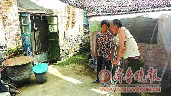 刘方方的家在招远市夏店镇西宅科村,距离招远市有一个多小时的车程。两间40多年前建造的房屋,屋顶上被雨水浸湿的痕迹清晰可见,刘方方拄着双拐的姥爷在大门口坐着,而她的母亲则躺在屋内的床上,家里唯一能自由活动的就是已经73岁的姥姥。