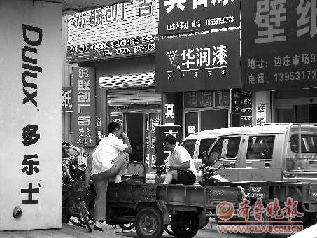 8日,在济南水屯路附近一建材市场,两名在市场内等活的工人正在吞云吐雾。而旁边就是两家漆店。