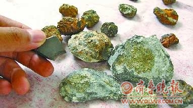 记者看到,高先生展示的“陨石”一共约20块,直径在1-3厘米左右,椭圆形多,表面呈黑褐色。“这块就是钻石陨石!”高先生拿起其中一块圆形石块给记者看,上面果然布满类似钻石菱状的凸起,只是光芒被一层黑褐色表皮所遮盖。用手触摸后一闻有一种类似焚烧的味道。