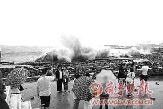 8日上午9点,在威海港公园海岸边,不断汹涌的海浪引得了20多名游客驻足观看,游客们纷纷拿出相机、手机,为背对大海的家人朋友拍照留念。记者看到,威海港公园海堤边有大量破碎的石板、砖块等物,海港商城的一位店主孙女士告诉记者,前段时候“米雷”登陆时,海浪就将海堤损毁,“前几天都快修好了,昨儿个下午听说要来台风了,又赶忙把钢筋、水泥都撤走了。”