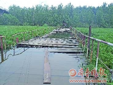 8日中午,记者来到了洸府河上的这座浮桥看到,浮桥的西部和中部的桥面都被河水淹没,已经完全不能通行。浮桥的两侧都设立了铁栅栏,其宽度只允许三轮车和两轮车通过。在浮桥西岸,由于很多人并不知道浮桥已坏,来到桥头才发现桥面已被水淹而不能过去,只得原路返回。而河东岸有骑摩托车的一家三口,试着想通过浮桥,看桥面被淹严重,只得无奈放弃。