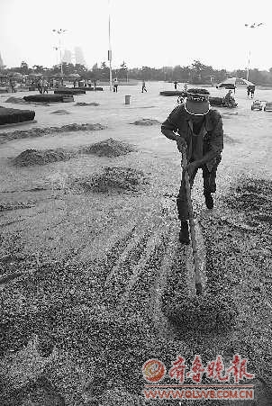 “这些都是昨天冲到广场上的海水带上来的。”万平口景区工作人员贺先生说。据景区现场清沙的工作人员介绍,这次淤沙的面积大约有三千平方米。“长近一百米,宽三十米的地带上几乎都有淤沙。”景区工作人员丁先生说。