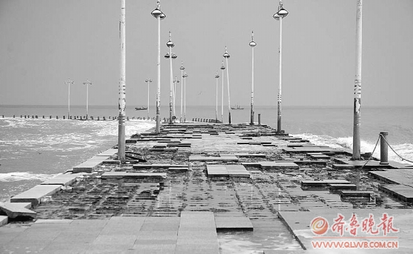 “你们两个干什么的,赶紧回来,不要命啦。”一名保安看到记者在栈桥上拍照,大声呼喊。还没等保安说完话,一个大浪打来,记者已是浑身湿透。