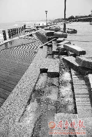 记者注意到栈道附近的海浪很大,不断有海水冲击到栈道及小广场上来。踏着没过鞋底的海水,记者小心翼翼地靠近栈道,一处护栏还存在,另一旁的护栏则已经没有。护栏内栈道表面的大理石已经被破坏的相当严重,许多大理石被卷到海里,连栈道两侧的石质立柱也未能幸免,不少立柱不见踪迹。