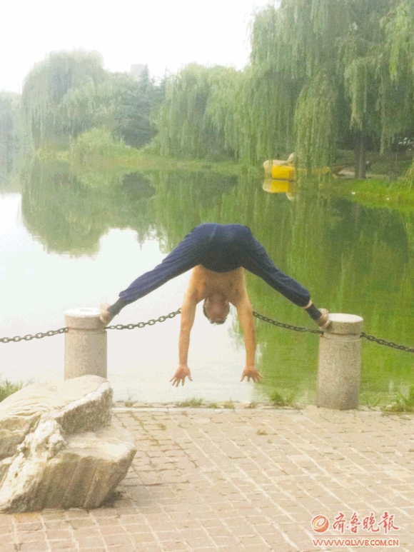8日上午,在南湖公园,一名男子先是双脚踩到湖边的防护铁链上来回晃动,接着又踩到了防护墩上倒立。