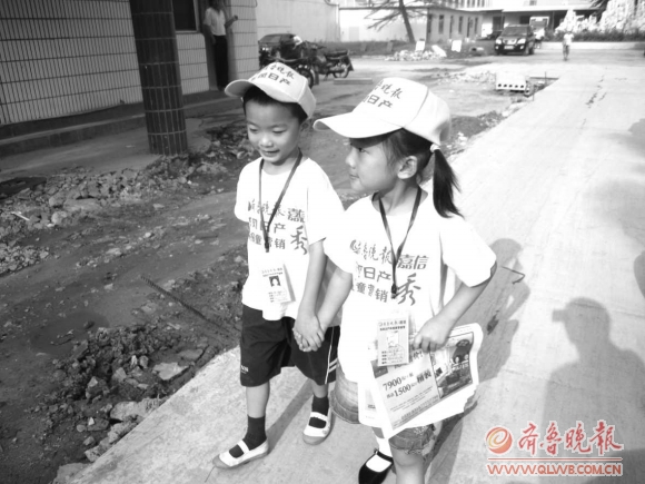 “卖报,卖报!”8日早晨8点10分,两名小报童手牵手来到肥城长山街,一起吆喝着卖报。这两名小报童就是莫国航和孙亦茹表兄妹,两人都只有5岁。“叔叔,买报纸吗?”孙亦茹的动作比哥哥快一步,迎上前问。“你们是双胞胎吗?来两份吧。”看到个头差不多,长相可爱的两个小报童,李先生误以为两人是双胞胎,随即买了两份报纸。记者看到,两个小报童经常瞄准同一个目标,在两人的轮番“攻势”下,大部分路人都会微笑着买下他们的报纸。