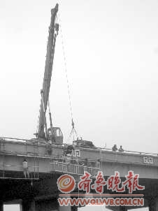 8月8日,新台儿庄桥上施工人员正在安装桥灯。近期,枣庄市台儿庄区正在进行“双桥亮化”建设,对新旧两座横跨京杭运河的台儿庄桥安装桥灯,美化桥面。 本报记者 袁沛民