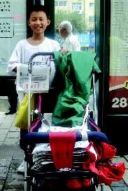 11岁的王东来是十里堡小学五年级的学生,今年是第三次参加营销秀了,今年最大的不同是,有了小推车。这是妹妹的小推车,妹妹一岁四个月了,换了新的车子,妈妈怕王东来拿报纸拿不过来,于是就想出了用小推车推报纸的方法。听说今天可能会下雨,王东来专门带了件雨衣搭在小推车上,盖住所有的报纸。小推车底下还放着雨伞、水壶、手机、便利袋,因为已经是卖报纸的老手了,所以装备相当齐全。