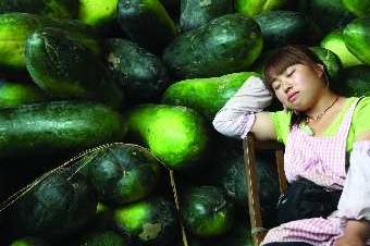 8日,在南下河蔬菜批发市场,一位冬瓜商贩在自己的摊位前打起了瞌睡。记者了解到,近一个多月,冬瓜的销量持续走低,目前市场上的冬瓜批发价在0.4元/斤左右,价格虽与去年同期基本持平,但销售量却比去年同期足足下降了近7成。