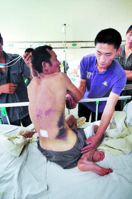 8月7日,记者在沂水县中心医院见到了躺在病床上的夏好祥,他的腿上布满了伤疤,胸部有一处引流胸腔积血留下的伤口,背部还有大片的淤青。