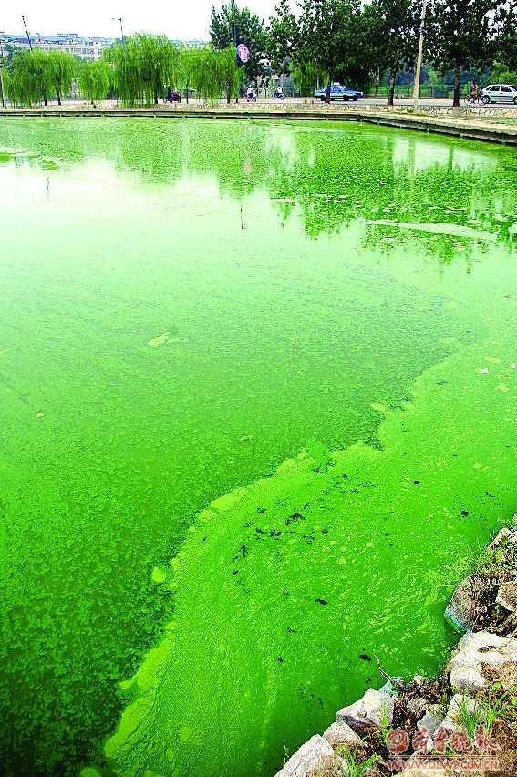 8日,记者看到青年湖及环城公园的湖水里,长满了厚厚的一层绿色“苔藓”,记者往河里投了块石头,溅起来的水也全是绿色的。周边钓鱼的市民告诉记者,这绿色根本不是苔藓,而是湖水因变质生腐出来的“绿色”。记者还看到湖边到处都是生活垃圾,污染越重,河水也就越来越来“绿”。