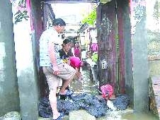 随后记者沿着水过膝的胡同往里走,看到巷子里各家各户都在忙着往屋外排水。记者走进一户居民家中,家门口已经垒起了特制的挡水门槛,门槛上是一个小型电动水泵,水管正在往外涌着水。“不光是院子里有水,连屋子里都进水了。”正在弯腰排水的居民孟庆喜对记者说,“你看看屋里的水都有这么深。”边说着话,边用手比划着大约能有20多公分的深度,记者在屋里看到,厨房、卧室都是漫过脚背的水。