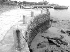 附近居民告诉记者,这些链子是被海边大浪给毁坏的,到现在有半个多月了,一直未见相关部门来此整修。“要是晚上没有这些链子防护,游客一不小心就可能跌落海中。”