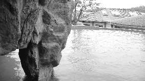 磁山温泉水疗馆内有一个室外大型的游泳池,池子紧靠磁山洞,从池子环顾四周,视线一览无余。碧蓝如天色的池水,与温泉内白墙灰瓦建筑相得益彰,清新明快,地中海风格浓烈。置身于此,一面是磁山群山的绵延,一面是磁山的百福塔,身边绿叶和热气腾腾的温泉水夹在在空气中淡淡地味道,从池子中走出来至磁山洞内,倒上一杯水,静静地坐在自带温泉池内或躺在藤椅上,享受这种安静、舒适的游泳环境。