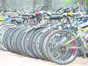 作品描述:校园内的自行车摆放紧密、整齐,一个个车轮排在一起,就像组合成一个宽大的车轮。